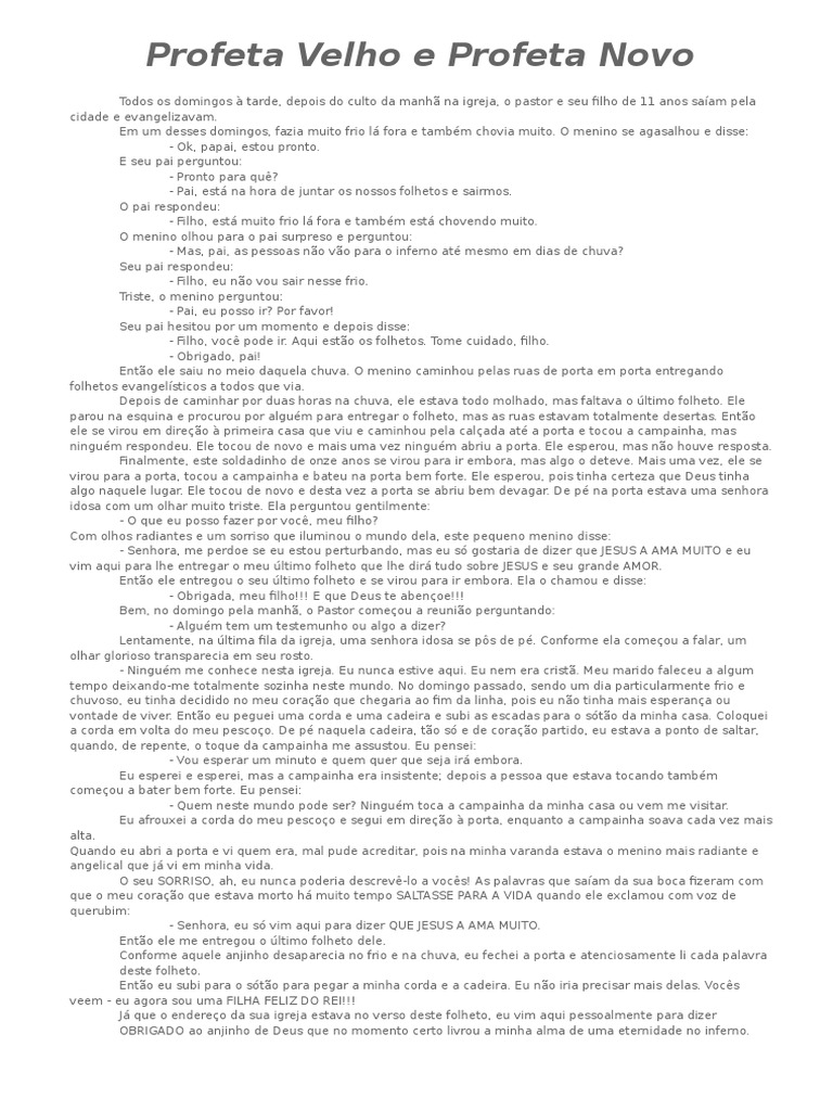 Profeta velho e profeta novo. Assim voltou com ele e comeu pão em sua casa e bebeu água. O profeta velho e o profeta novo Mensagens Bíblicas. O dom de profecia em seu sentido original no Novo Testamento é um privilégio especial concedido pelo Espírito Santo a certos membros das igrejas para receber e transmitir mensagens e revelações vindas de Deus.